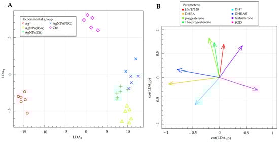 Fisher’s LDA: (A)—experimental data on the plane spanned by two of the most data-separating LDAs; (B)—parameters contributing the most to LDAs. Hsd17b10—gene expression of hydroxysteroid (17β-beta) dehydrogenase 10; DHEA—level of dehydroepiandrosterone; DHT—level of dihydrotestosterone; DHEAS—level of dehydroepiandrosterone sulfate; SOD—activity of superoxide dismutase.