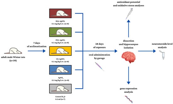 Due to the widespread use of AgNPs in the food industry and medicine, as well as the increasing environmental risk associated with exposure to AgNPs, researchers have been investigating the safety of nanomaterials use []. AgNPs are found in a wide range of household products used on a daily basis, such as biomedicine products, textiles, hygiene and personal care items, food storage supplies, and so on []. Additionally, AgNPs have been studied as potential drug delivery and radiosensitizing efficacies in gliomas as well as agents for diagnosing and treating neurodegenerative diseases []. This extensive usage of AgNPs and their proven ability to cross biological barriers, such as the blood–brain barrier, have raised concerns about their potential influence on brain functions. Results obtained by Recordati et al. showed high deposition of silver in the brain after oral exposure of environmentally relevant dose of citrate-coated AgNPs at the end of the administration as well as after 4 weeks of recovery that highlighted slow elimination of Ag from the brain structures []. Our previous study has also shown that oral administration of AgNPs at a relatively small concentration resulted in a time-dependent accumulation of silver in the brain, particularly in the hippocampus, and simultaneous deterioration of learning skills in rats [,]. Additionally, our recent studies demonstrated that the effect of AgNPs on cognitive functions is determined by the coating used for the stabilization of these nanoparticles. It was found that exposure to AgNPs coated with BSA and PEG, as well as AgNO3 as a source of Ag+, was associated with impairment of hippocampal-dependent cognitive functions []. Taking into account the results of our studies and the possible toxicity of AgNPs toward the central nervous system (CNS), in the present study we investigated the mechanisms underlying the observed impairment of cognition functions after oral administration of AgNPs at environmentally relevant concentrations.