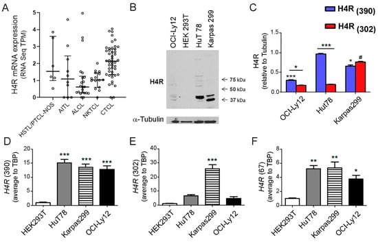 We further investigated the expression of H4R isoforms at the mRNA level. The primers were designed to amplify individually each H4R isoform’s transcript. High expression of the H4R(390) isoform mRNA at similar levels was observed in HuT78, Karpas299, and OCI-Ly12 TCL cells (Figure 1D). In contrast, the H4R(302) isoform mRNA expression exhibited different levels, depending on the cell line (Figure 1E). Karpas299 cells significantly showed the highest expression of H4R(302) isoform compared to HuT78 and OCI-Ly12 cells (Figure 1E). Truncated H4R(67) isoform mRNA showed the lowest expression level in all cell lines compared to the other two isoforms (Figure 1F).
