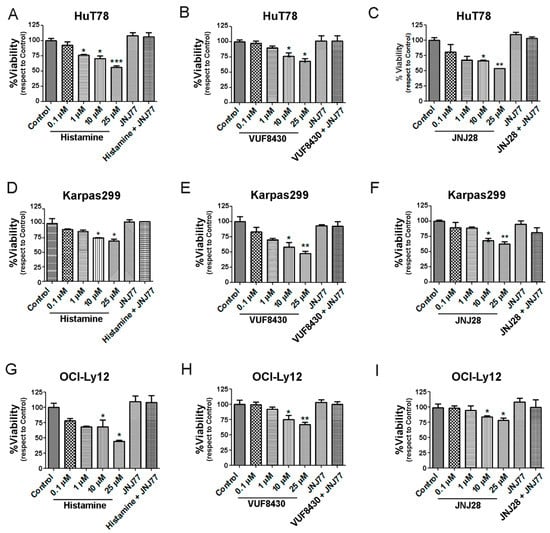 Effect of histamine and H4R agonists on the viability of HuT78, Karpas299, and OCI-Ly12 cells. Cells were pre-incubated for 24 h in serum-free RPMI medium and then treated as indicated: HuT78 (A–C), Karpas299 (D–F), OCI-Ly12 (G–I) cells were left untreated (control) or were treated with histamine, JNJ28, VUF8430 (0.1, 1, 10 and 25 µM) or JNJ77 (10 μM), and histamine (10 µM), JNJ28 (10 µM), VUF8430 (10 µM) combined with JNJ77 (10 μM) for 48 h in complete medium and viability was evaluated by Cell Titer Blue Assay. Measurements were performed in triplicates for each condition and cell line and data are expressed as mean ± SEM (n = 3 independent experiments). * indicates p < 0.05, ** indicates p < 0.01, *** indicates p < 0.001 compared with Control.