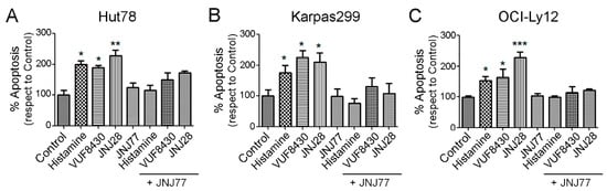 To corroborate the biological significance of H4R in TCL cell lines, we next analyzed the apoptotic regulation induced by histamine, JNJ28, and VUF8430. The treatment of HuT78 cells with histamine (10 µM), JNJ28 (10 µM), or VUF8430 (10 µM) for 48 h increased the percentage of apoptotic cells evaluated by Caspase-Glo 3/7 Assay (Figure 3A). The apoptotic effect was reversed when JNJ77 (10 µM) was added to the medium 30 min before H4R agonists’ treatment. Similar results were observed in Karpas299 (Figure 3B) and OCI-Ly12 cells (Figure 3C).