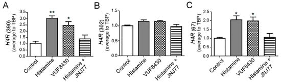 To elucidate whether H4R ligands’ treatment could modulate H4R expression, the mRNA expression of the three isoforms were analyzed upon histamine (10 µM) and VUF8430 (10 µM) treatment for 30 min in HuT78 cells. As depicted in Figure 4A, histamine and VUF8430 increased H4R(390) isoform’s expression, an effect that was blocked with the treatment with JNJ77 (10 µM). A similar pattern of expression was observed for the H4R(67) isoform (Figure 4C). However, no significant changes were observed in the expression of H4R(302) isoform (Figure 4B).