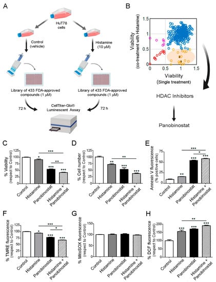 Screening of a library of 433 FDA-approved compounds. Effect of the combination of histamine and panobinostat on HuT78 cell proliferation, apoptosis, and ROS production. HuT78 cells were pre-incubated for 24 h in serum-free RPMI medium and then were treated with the FDA-approved drug (single treatment) or were treated with the combination of histamine (10 μM) plus FDA-approved compound for 72 h in triplicates for each condition. (A) Experimental design. (B) Results of the screening experiment, showing potential favorable effects with the combined treatment of histamine plus HDAC inhibitors: (1) panobinostat, (2) belinostat. (C) HuT78 cells were pre-incubated for 24 h in serum-free RPMI medium and then were left untreated (control) or were treated with histamine (10 µM) and/or panobinostat (1 µM) for 48 h in complete medium, as indicated. Cell viability was evaluated by Cell Titer Blue Assay. (D) The cell number was counted using a Neubauer chamber. (E) Percentage of Annexin-V positive cells. (F) Mitochondrial membrane potential measured by the TMRE fluorescence determination. (G) MitoSOX fluorescence (5 µM) was measured using a microplate reader. (H) DCF fluorescence (10 µM DCFH-DA) was measured using a microplate reader. Measurements were performed in quintuplicate (C) and triplicates (D–H) for each condition and cell line and data are expressed as mean ± SEM (n = 3 independent experiments). * indicates p < 0.05, ** indicates p < 0.01, *** indicates p < 0.001 compared with Control.