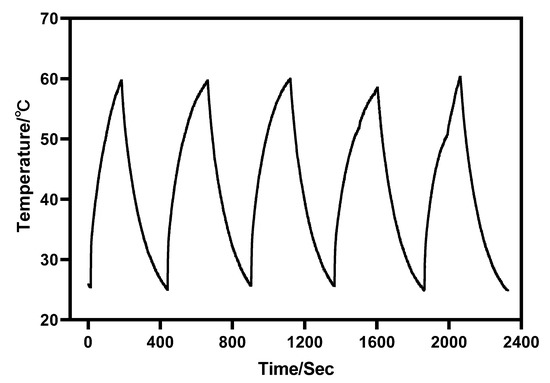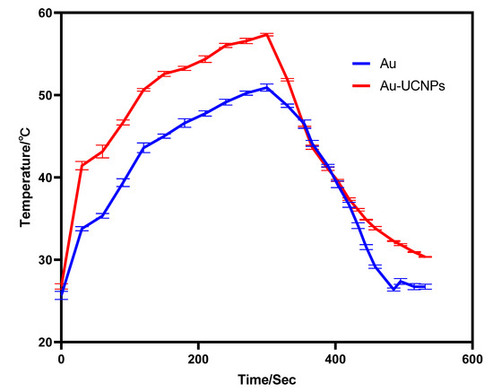 Furthermore, under the irradiation of near-infrared light with a wavelength of 980 nm, Au-UCNPs raises the temperature to 59 °C in 250 s, immediately stops the irradiation, cools to room temperature in about 160 s, re irradiates for about 280 s, raises the temperature to 59 °C again, and repeats the cycle five times. Au-UCNPs still show good photothermal effect (Figure 4). However, gold nanoparticles cannot be heated and cooled again under 540 nm wavelength laser irradiation (Figure 1), which shows that gold nanoparticles do not have good photothermal stability (Figure S4). Many experts [24] think that when gold nanoparticles are not modified in any way, the outer electrons of gold nanoparticles are stimulated in the excited state, and the energy level transition happens during the process of returning to the ground state. The surface structure of gold nanoparticles has altered during the energy conversion process, resulting in a mild exothermic effect when re-excited (Figure S5).