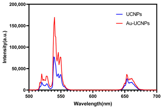 Luminescent intensity of UCNPs (blue) and Au-UCNPs (red).