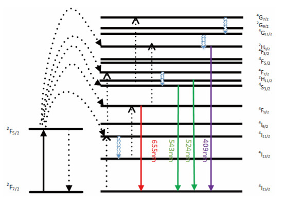 The emission bands are observed at 409 nm (purple), 524 nm, 543 nm (green), and 655 nm (red) are due to the transitions of Er3+ ions such as 2H9/2 → 4I15/2, 2H11/2 → 4I15/2, 4S3/2 → 4I15/2 and 4F9/2 → 4I15/2, respectively (Figure 3). However, it is observed that the red and green emissions become more prominent than the purple emission, which might be attributed to the cross-relaxation process from 2G7/2 to 2H9/2 levels. Purple, green, and red lights exhibit varying degrees of enhancement. The SPR absorption peak at 520 nm coincides with the emission band of green light, so the SPR vibration frequency overlaps the luminescence band of UCNPs, the coupling of the emitted light and the SPR increases the photon localized state density near the surface of Au, thereby increasing the radiation decay rate of Er3+, also increasing the luminous intensity. Moreover, the excitation wavelength of 980 nm excites the higher-lying 4F7/2 level of Er3+ ions and Au partially absorb emissions coming from Er3+ ions that lead to de-excitation of the fluorescence of UCNPs.