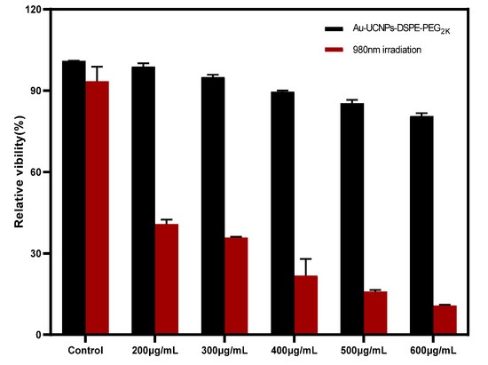 Cytotoxicity of different concentrations of Au-UCNPs-DSPE-PEG2K before and after irradiation.