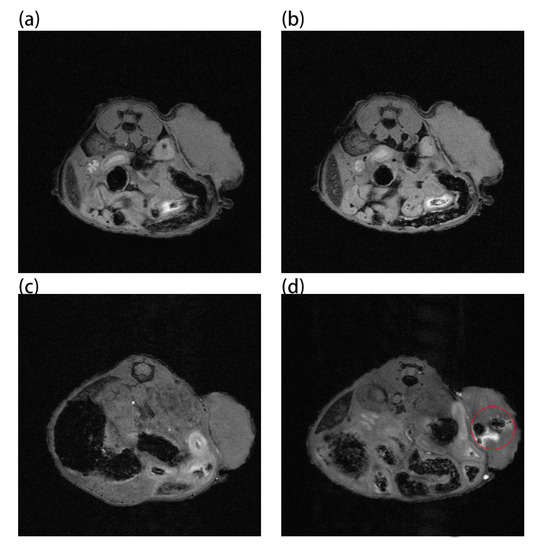 Au and Au-UCNPs-DSPE-PEG2K nanoparticles are injected intravenously into Balb/c mice (Figure 6). As can be seen from Figure 6a,b, there is no difference in MRI images before and after gold nanoparticles injection, demonstrating that gold nanoparticles have no MRI imaging capabilities due to their lack of X-ray attenuation. After injection of Au-UCNPs nanoparticles, obvious MRI signals appear at the tumor location (in the red circle in Figure 6d), which is due to the X-ray attenuation characteristics of UCNPs (Figure S8).
