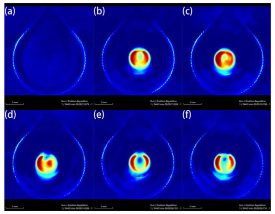 Photoacoustic imaging (PAI) of different concentrations of Au-UCNPs-DSPE-PEG2K, (a) 0 µg/mL, (b) 60 µg/mL, (c) 120 µg/mL, (d) 180 µg/mL, (e) 240 µg/mL, (f) 300 µg/mL.