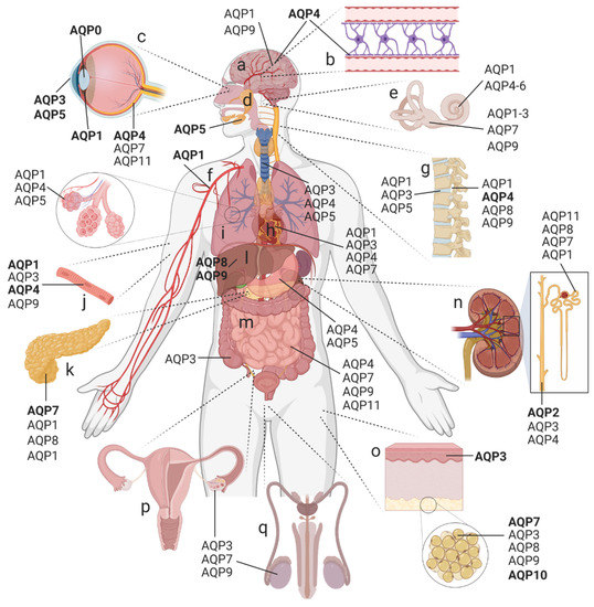 AQP distribution in the human body. Expression of AQP paralogs in the (a) brain, (b) blood–brain barrier, (c) eye, (d) exocrine glands, (e) inner ear, (f) cardiovascular system, (g) spine, (h) heart, (i) respiratory tract (trachea and lung; inset showing alveoli), (j) skeletal muscle, (k) pancreas, (l) liver, (m) gastrointestinal tract, (n) kidney, (o) skin (inset showing adipose tissue), and (p) female as well as (q) male reproductive tracts. This summary is not comprehensive; minor AQP subtypes are omitted for clarity. Bold text is used to highlight the major AQPs studied in the selected tissues. Created with BioRender.com; adapted from Day et al., 2014 [12].