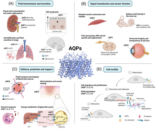 Functional roles of AQPs. (A) Fluid homeostasis and secretion: In the kidney, AQP1 regulates water reabsorption in the proximal tubules, while AQP2–4 are involved in urine concentration. In the central nervous system (CNS), AQP1 is involved in cerebrospinal fluid (CSF) production in the choroid plexus. In the lungs, AQPs facilitate transendothelial and transepithelial water flow. (B) Signal transduction and sensor function: AQP4 is involved in skeletal muscle contraction and viability. In the spinal cord, AQP1 is thought to contribute to pain processing and promote axonal growth as well as the regeneration of dorsal root ganglia (DRG). In the inner ear, AQPs are involved in balance and hearing. In the eye, AQP0 facilitates the structural integrity and transparency of the lens. (C) Defense, protection, and support: AQP4 is involved in blood–brain barrier (BBB) integrity, astrocyte plasticity, glial scar formation, and cerebral waste clearance. AQP3 supports skin hydration and wound healing. AQP1, 3, 5, 7, and 9 are involved in immune cell activation and pathogen elimination (phagocytosis). AQP7, 9, and 10 are involved in the glycerol transport that supports energy metabolism. (D) Cell motility: AQP1, 4, 5, and 9 are polarized at the leading edge of migrating cells and are thought to promote the cellular migration stages of polarization, protrusion, adhesion, and retraction. Additionally, AQP1, 3, 4, and 9 are assumed to enhance the degradation of the extracellular matrix (ECM). Created with BioRender.com.