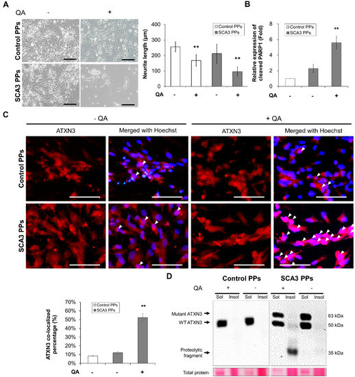 In order to investigate whether the SCA3 PPs can exhibit pathological characteristics in the presence of QA, the analysis of neurite loss, apoptotic status as indicated by PARP1 expression, and the co-localization of expression of mutant ATXN3 were performed in SCA3 PPs after 35 days of differentiation.