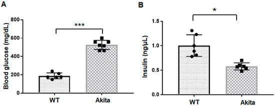 Validation of T1DM phenotype in the Akita mice. (A) Fasting blood glucose levels were measured by glucometer in WT and Akita mice. Values are mean ± SEM. n = 6. (B) Serum insulin levels were measured by ELISA method in WT and Akita mice. n = 5–6. Values are mean ± SE. Statistical analysis was conducted via a paired Student’s t-test. *** p < 0.001; * p < 0.05 (the exact p-value was 0.01).