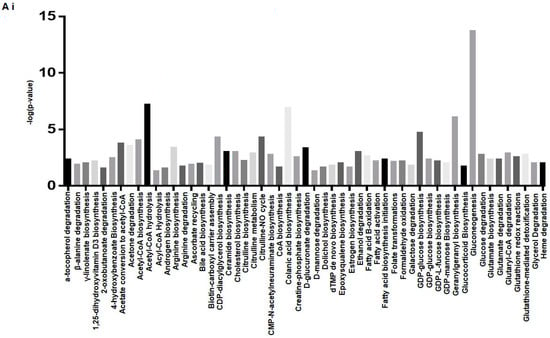 Genes associated with metabolic pathways and metabolites from the comparison analysis were analyzed using the Ingenuity Pathway Analysis (IPA) tool (QIAGEN, Germantown, MD, USA), based on the absolute value of the test_stat parameter. Murine genes and metabolites demonstrating both direct and indirect interactions were selected and analyzed based on their log2 fold change values (Exp Log Ratio).