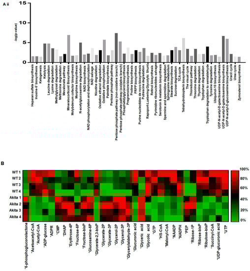 LC-MS metabolomics analysis of Akita compared to WT hearts. (Ai,Aii) Top predicted canonical metabolic pathways disrupted in the Akita heart with a –log(p-value) > 1.3 based on metabolite IPA analysis. (B) Heatmap indicating percent change of individual metabolites associated with the listed pathways in the Akita and WT hearts based on the expression log ratio calculated from individual metabolite expression; p-value < 0.05. n = 4.
