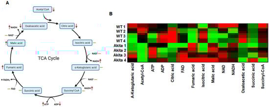 Differential expression of key metabolites involved in the tricarboxylic acid (TCA) cycle in the Akita heart by Ingenuity Pathway Analyses (IPA) of metabolites. (A) TCA cycle metabolite intermediates in Akita versus WT mice. Line indicates no change between groups. *FADH levels were undetected. (B) Heatmap indicating percent change of single metabolite levels associated with the TCA cycle in Akita and WT mice. Analysis conducted with Ingenuity Pathway Analysis software. n = 4.