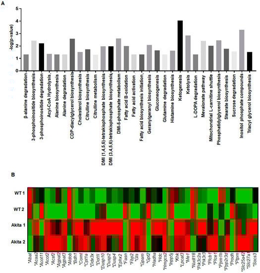 Genomics analysis of the Akita compared to WT hearts from next generation sequencing. (A) Based on Ingenuity Pathway Analysis (IPA) of genes obtained from next-generation sequencing showing the top predicted canonical metabolism pathways disrupted in the Akita heart with a –log(p-value) > 1.3. (B) Heatmap showing percent change in genes associated with the aforementioned metabolic pathways in the Akita heartbased on the expression log ratio calculated from FPKM values. All genes associated with the predicted pathways had a p-value < 0.05. n = 2.