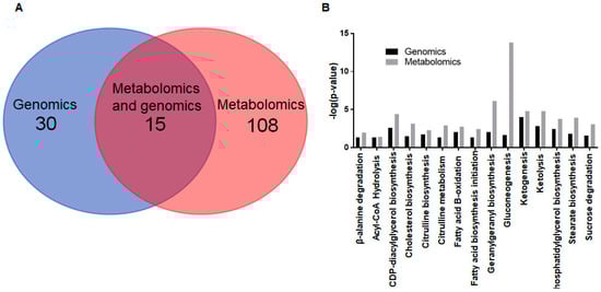 To determine the synergistic and independent effects of genes and metabolites behind T1DM-induced changes in metabolism, we selected the metabolic pathways that were disrupted in both the metabolomic and genomic datasets. Metabolomics indicated 108 disrupted metabolic pathways, and genomics indicated 30 disrupted metabolic pathways in the Akita heart (Figure 5A). We observed a total of 15 common deranged pathways from both genetic and metabolomic analyses (Figure 5B).
