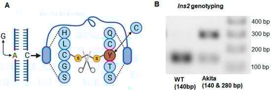 Characterization of the Akita mouse model. (A) Akita mice have a G-to-A point mutation in their Insulin 2 (Ins2) gene, causing the severing of disulfide from a cysteine-to-tyrosine substitution. (B) Genotyping of Akita and littermate/sibling, normoglycemic WT mice. WT mice present a single band representing an allele at 140 base pairs (bp), while Akita mice demonstrate two bands at 140 and 280 bp, indicating the presence of two alleles.