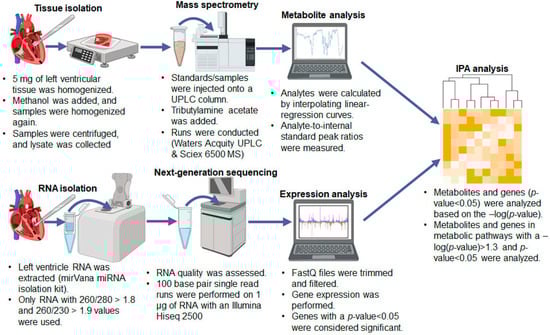 Overall study design for metabolomic and genomic analysis of heart tissue of Akita. Tissue was isolated specifically from the heart’s left ventricle (LV). LV tissue was prepared for liquid chromatography-mass spectrophotometry (LC-MS), and metabolites were analyzed. Ingenuity Pathway Analysis (IPA) was used to determine the association of metabolites with metabolic pathways. LV tissue was also used for RNA isolation and next-generation sequencing to evaluate gene expression. IPA was performed on differentially expressed genes to evaluate their roles in disrupted metabolic pathways. Both metabolomic and genomic analyses were compared to identify key pathways behind the regulation of metabolic remodeling in the Akita heart.