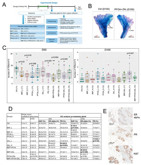 The endocrine system plays an important role in mammary gland development. We measured the weight of the endocrine organs and examined their histology. Exposure to BBP + PFOA caused a trend of increased ovarian weight at D50 compared to controls. Exposure to ZAL_L, BBP + PFOA, BBP + ZAL, and BBP + PFOA + ZAL caused an increase in ovarian weight, and PFOA + ZAL tended to increase ovaries’ weight, at D100 (Figure 2A and Figure S6A). No significant difference was found by histological examination.
