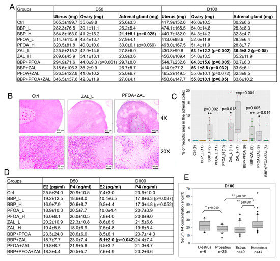 Changes in endocrine organs and serum hormones induced by exposure to BBP, PFOA, and ZAL: (A) Table shows the wet weight of uteri, ovaries, and adrenal glands at D50 and D100. The mean weight of two ovaries or adrenal glands of each rat was calculated and used to conduct the analysis. Sample size information is included in the Supplementary Materials. (B) Representative images of adrenal glands by H&E staining, showing necrosis in the adrenal cortex. Scale bar: 200 µm for 4×, 50 µm for 20× objective. (C) Quantification of the necrotic area in the adrenal gland cortex; each dot represents one rat. The samples with poor sectioning were excluded. (D) Serum E2 and P4 concentrations at D50 and D100; data are presented as the mean ± STD. (E) Association of serum P4 concentration with the phase of the estrous cycle. Only the samples that had enough cells for vaginal smear analysis were included. The Mann–Whitney rank sum test was used to perform the analysis; * indicates p < 0.05, ** indicates p < 0.01 compared to Ctrl for (A,C,D).
