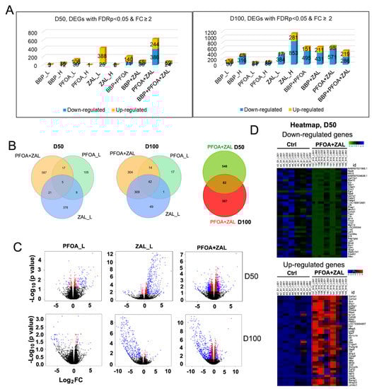 Heatmaps depicting the top 40 (for D50) and 50 (for D100) down- or upregulated genes with the highest or lowest expression for the PFOA + ZAL group are shown in Figure 3D and Figure S12, respectively. As shown in the heatmaps, the two reads of each sample were very consistent.