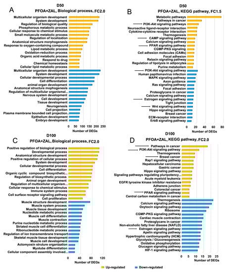 Biological process and KEGG pathway analysis of DEGs induced by PFOA + ZAL: (A,C) Bar graphs represent genes categorized according to their most prominent biological function. Gene Ontology annotations were extracted using DAVID tools and the Shiny application in R version 3.5.3. (B,D) Involvement of the KEGG pathway genes was determined using KEGG web tools and the Shiny application in R version 3.5.3. Arrows indicate pathways discussed in the paper.