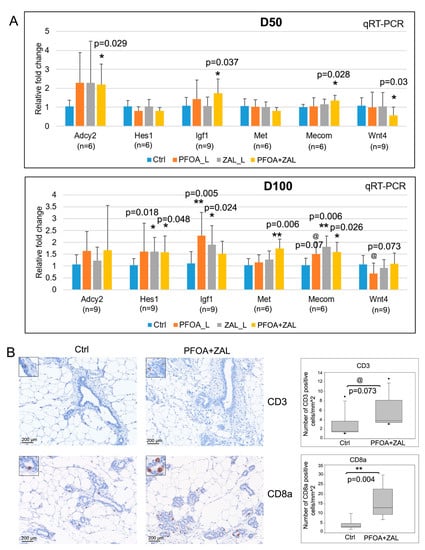In addition, researchers have shown that exposure to EDCs deregulates adaptive and innate immune mechanisms and interferes with cellular and humoral activities [46]. Therefore, CD3 and CD8a expression in the PFOA + ZAL group at D50—the group that we focused on—were analyzed by IHC as part of a cross Breast Cancer and the Environment Research Program (BCERP) consortia endpoint. The results showed that PFOA + ZAL exposure significantly increased the number of CD8a-positive cells, and tended to increase the number of CD3-positive cells in the mammary gland at D50 (Figure 5B and Figure S16). We further confirmed via qRT-PCR that the RNA expression of Cd8a was significantly increased in PFOA + ZAL, and tended to be upregulated in the ZAL_L group at D50 (Figure S17). These results demonstrated an overall impact of exposure to PFOA_L, ZAL_L, and PFOA + ZAL on BPs including development, metabolic processes, muscle systems, the immune system, and on KEGG pathways such as the estrogen signaling pathway, Wnt signaling pathway, and pathways associated with tumorigenesis.