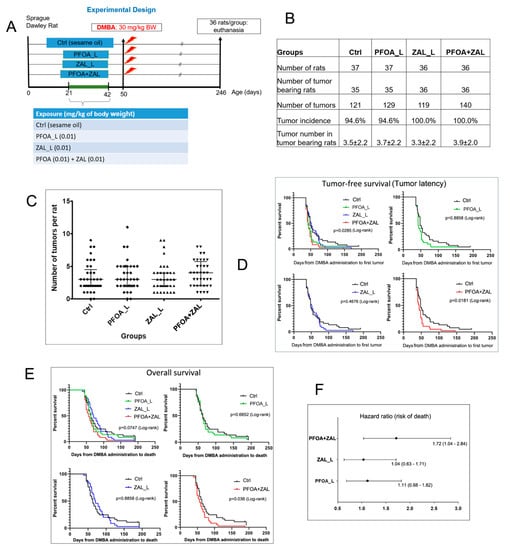 Effects of exposure to PFOA_L, ZAL_L, and PFOA + ZAL on mammary tumorigenesis: (A) Experimental design for the mammary tumorigenesis study. Female Sprague Dawley rats were treated with low doses of PFOA, ZAL, or their combination from ages of 21 to 42 days, and were given one dose of DMBA at 30 mg/kg body weight at the age of 50 days. (B) Table shows tumor incidence and the numbers of tumors in tumor-bearing rats. (C) Dot plots show the number of mammary tumors developed in each rat; each dot represents one rat. One-way ANOVA, p = 0.674. The three lines in the dot plots indicate the lower quartile, median, and upper quartile. (D) Kaplan-Meier tumor-free survival calculated by the time period from DMBA administration to the appearance of the first tumor, indicating tumor latency. (E) Kaplan-Meier overall survival calculated by the time period from DMBA administration to the day of euthanasia. (F) Hazard ratio analysis of risk of death using Prism 8.0.