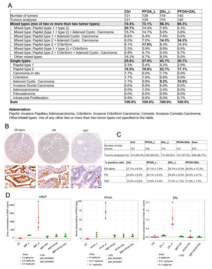 Histopathological analysis and molecular classification of rat mammary tumors: The histopathological type of each tumor was presented as single type when only one histopathological type was found on the tumor, or mixed type when two or more histopathological types were observed on a tumor. (A) Histological evaluation of the rat mammary tumors. (B) IHC analysis of Ki67, ER alpha, and PR in rat mammary tumors. Upper panel: representative image of one tissue microarray core of each staining. Bottom panel: one high-magnification (40× objective) field showing the staining of the cell nuclei. Scale bar: 20 µm. (C) Tables show sample size for IHC analysis and the percentage of positive cells for each staining. Data are presented as the mean ± STD. (D) Measurement of the BBP metabolite mBzP in urine, and serum concentrations of PFOA and ZAL at the age of 43 days—1 day after the last administration. NHANES: National Health and Nutrition Examination Survey; LOQ: limit of quantification; p50_NHANES and p95_NHANES represent the 50% and 95% percentile levels in the NHANES 2002–2012 data, respectively.