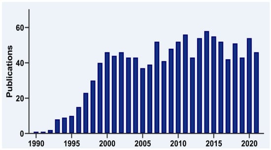 Timeline of TIA1 publications. Histogram representation of the timeline of literature, searching for TIA1/TIA-1 terms in the PubMed/MEDLINE database.