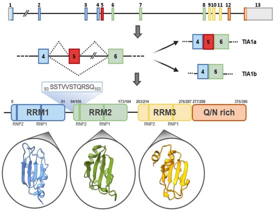 The human TIA1 gene is located on chromosomal region 2p13 and consists of 13 exons that, by alternative splicing, can give rise to two major isoforms. At the structural level, TIA1 is similar to other classical RBPs, consisting of three RNA-recognition motifs (RRMs) and a low-complexity glutamine and asparagine (Q/N)-rich carboxyl-terminal domain, which favors protein-protein interactions [2] (Figure 2). In addition, two ribonucleoprotein-forming consensus peptide sequences are conserved within each RRM: RNP1 (8 amino acids), and RNP2 (6 amino acids) [1,2] (Figure 2). Of its 13 exons, exons 1–4 encode RRM1, 5–8 RRM2 and 9–11 RRM3, and exons 12 and 13 encode the C-terminal domain and the 3′-untranslated region (3′-UTR) of its mature messenger RNA (mRNA). Exon 5, which encodes 11 amino acids at the beginning of RRM2, is subject to alternative splicing, which gives rise to TIA1a (43 kDa, including the exon) and TIA1b (40 kDa, omitting the exon) isoforms [1,2] (Figure 2). In the absence of an RNA to bind to, the three RRMs of TIA1 behave as independent structural modules connected by peptide bridges, with almost no intramolecular interaction. Binding to RNA triggers the compaction of the protein domains to form a more rigid RNA-protein complex [3,4].