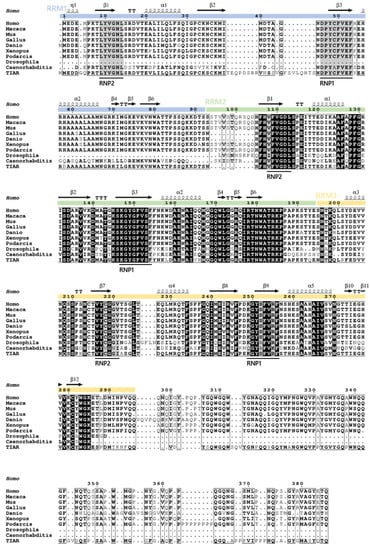 Alignment of the primary protein sequence of TIA1 with TIAR and orthologs from different vertebrate species, Caenorhabditis elegans and Drosophila melanogaster, illustrates the high degree of shared identity (Figure 3). This, together with the existence of structural and functional orthologs both in vertebrates and in invertebrate species, underlines the biological importance of these proteins, which are conserved from the earliest ancestors. However, it is the RRMs that show the highest degree of similarity, with RRM2 (the most involved in RNA-protein interactions) being the most conserved among orthologs, implying strong functional conservation of the mechanism of action of these proteins. By contrast, the C-terminal prion-like domain is much less conserved, likely as a result of a lower selection pressure. Nevertheless, there is a propensity for Q-rich motifs to exist at this end, with few exceptions, including D. melanogaster and C. elegans [7]. Included among the structural and/or functional orthologs of TIA1 proteins in non-vertebrate taxonomic groups are Rox8, present in D. melanogaster [8]; UBP1 and RBP45/47, present in plants [9,10]; Nam8p [11,12,13] and PUB1 [14,15], present in yeast; Ngr1/Rbp1 [16], present in fungi; and SfTRN-1 and BmTRN-1, present in worms [17,18].
