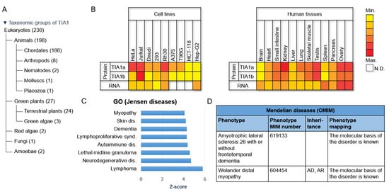 Phylogenetic trees, cellular- and tissular-expression profiling, and Jensen and Mendelian diseases associated with TIA1. (A) Taxonomic groups of TIA1 and TIAR orthologs according to the NCBI (National Center for Biotechnology Information) database. (B) Expression patterns of TIA1 in human cell lines and in human and mouse tissues. HeLa (uterine carcinoma), Jurkat (T lymphoma), Daudi (B lymphoma), HEK293 (human embryonic kidney), Rh30 (bone marrow rhabdomyosarcoma), A375 (melanoma), T98G (glioblastoma), HCT-116 (colon carcinoma), Hep-G2 (liver carcinoma). (C) Gene Ontology (GO) of human diseases related to TIA expression, according to Jensen’s classification. (D) Catalog of genetic disorders associated with TIA1 expression based on the Online Mendelian Inheritance in Man (OMIM) database.