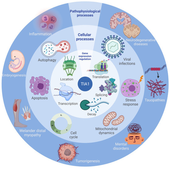 The hallmarks of TIA1 on gene-expression regulation/flux, as well as cellular and pathophysiological processes. Schematic representation of the main processes of gene-expression regulation, cellular events and pathophysiological processes associated with TIA1 expression. This figure was created with BioRender.com (accessed on 20 December 2021).