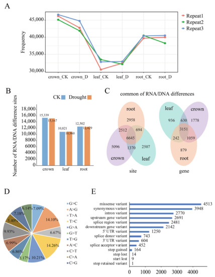 To identify potential RNA/DNA differences, we used the 18 RNA-Seq datasets of 3 tissues collected from the genotype CS42 seedlings under drought and control conditions, which is the same accession used to generate the reference genome. Based on the approach described in the Methods section, a total of 15,339, 10,821 and 12,502 RDDs were found in the control samples of crown, leaf and root respectively, while 15,167, 10,960, 12,429 RDDs were identified in drought-stressed samples of the crown, leaf and root, respectively (Figure 1A,B). It seems that the CK sample displayed slightly higher RDDs compared to the drought-treated sample in all of the 3 tissues. Meanwhile, for both the CK and drought condition, leaves had the lowest RDDs. These results indicated that RDDs were widely found in wheat nuclear genome. Furthermore, 21,782 unique RDDs were obtained through combining these identified RDDs, of which 8675 appeared in protein-coding genes (Table S1). Among them, 4205 genes had one RDD, followed by 1794, 1068 and 588 genes with 2, 3 and 4 RDDs, and 1020 genes with more than 5 RDDs, respectively. Overall, 15,623, 11,216, 12,809 RDDs corresponding to 6618, 4959 and 5331 genes were found in crown, leaves and root respectively, of which 6645 RDDs in 3151 genes were commonly found in all of the three tissues (Figure 1C). For RNA/DNA difference type, all of the 12 conversion types were found, of which the conversion between C and T accounted for 24.19% of all sites, and conversion between A and G accounted for 24.31% respectively, which were the two canonical RNA/DNA difference types [31]. Additionally, C to G (7.18%) and G to C (7.09%), A to C (6.99%), T to G (6.86%), T to A (6.67%), A to T (6.14%), and C to A (5.40%) as well as G to T (5.17%) were also identified (Figure 1D). Gene annotation showed that 12,325, 2770, 1250 and 604 RDDs were located in the CDS, intron, 5′UTR and 3′UTR regions, respectively. Furthermore, 4513 and 3948 RDDs were annotated as missense variants and synonymous variants, accounting for 20.72% and 18.13% of RDDs, respectively, of which 189 RDDs could result in the premature stop or loss of the start/termination codons (Figure 1E).