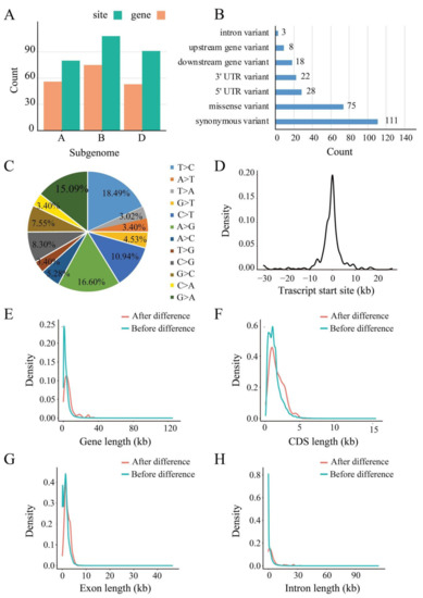 Characterization of the drought-responsive RDDs. (A) The numbers of drought-responsive RDD and related-genes in A, B, D subgenome, respectively; (B) The distribution of drought-responsive RDDs in the transcription regions. The y-axis represents different types of regions, and the x-axis represents the abundance of RNA/DNA difference sites; (C) The variation types of the identified drought-responsive RDDs; (D) The distance of the distribution of drought-responsive RDD site and the TSS (transcription start site) in the RDD-containing genes; (E–H) Comparison of gene length, CDS length, exon length, and intron length of gene without RDD and with RDD.