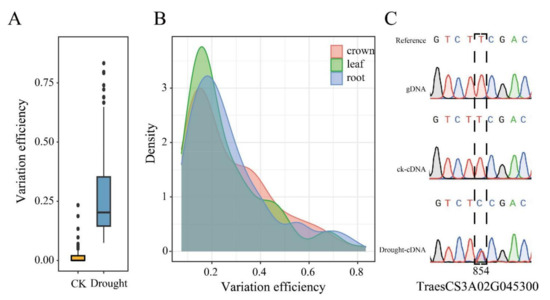 Variation efficiency and validation of these identified RDDs. (A) Comparison of the variation efficiency of RDDs between CK and drought conditions; (B) the distribution of variation efficiency in 3 different tissues; (C) Validation of the randomly selected drought-responsive RDD in TraesCS3A02G045300 through RT-PCR combined with Sanger sequencing.