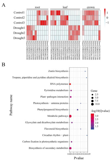 Wheat (Triticum aestivum L.) is one of the most important cereal crops all over the world, providing the staple food source for about 30% of the global population and occupying approximately 20% of the world’s cultivated lands [1]. Continuity of wheat production holds promise for ensuring global food security despite the challenges of population growth and global climate change [2,3,4]. It is estimated that wheat production should increase by 1.5% annually to meet the requirements of increasing population [5]. Drought is one of the most destructive environmental stresses that impair plant growth and development, reducing yields [6]. Recently, drought has become the most serious constraint to wheat production, causing about 5.5% yield loss every year [7,8]. Therefore, better understanding of the molecular mechanisms of drought response in wheat is of great significance for genetic improvement and breeding of drought-tolerant varieties.