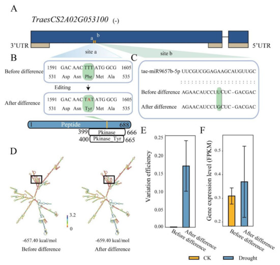 miRNA is a class of small non-coding RNAs that often bind to complementary sequences of the mRNA targets to silence or weaken their expression [30]. RDD generally caused variations in mRNA sequence, which could make the transcripts gain or lose miRNA binding [39]. To understand the effects of drought responsive RDDs on miRNA targeting, we further investigated miRNA-mRNA targeting pairs using the genes with or without RDD mutations as target genes. Results showed that there were 160 genes that were potentially targeted by 81 unique high-confidence mature miRNAs of wheat, containing 236 RDDs (Table S5), of which 3 RDDs occurring in 3 genes were detected to result in the changing of miRNA targets compared to the initial genes without RDD. We found two RDD sites (chr2A_21252947: A to T; chr2A_21252961: A to C) occurring in TraesCS2A02G053100 (Figure 5A): the T to A site changed the amino acid from Phe to Tyr (Figure 5B), and the T to G site made it lose the binding of tae-miR9657b-5p (Figure 5C). Meanwhile, the RNA secondary structure of this gene was also changed by the RDD sites (Figure 5D), that the MFE value changed from −657.40 to −659.40 kcal/mol. Furthermore, the difference efficiency of T to G in TraesCS2A02G053100 is 0.18 under the drought condition while not occurring in CK with the variation efficiency of 0 (Figure 5E). The expression level of this gene was also slightly higher under the drought condition compared to CK (Figure 5F). These results indicated that RDD could precisely regulate the expression level of the target genes through mediating miRNA targeting with variable variation efficiency. In addition, orthologs analysis found that TraesCS2A02G053100 is the ortholog of OsRLCK. OsRLCK is reported as the key candidate associated with QTL for drought stress related traits [40], suggesting that TraesCS2A02G053100 could also have potential function in response to drought stress. The RDD occurring in this gene might play an indispensable role in regulating the sophisticated process of drought response that this gene was involved in.