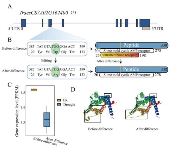 RNA/DNA difference is a post-transcriptional modification mechanism to increase proteomic diversity by modifying protein composition, protein structure and binding ability [41]. To understand the effect of drought-responsive RDD on the encoded protein structure, we investigated and compared the conserved domain organization of the genes with missense variant and stop gained due to RDD before and after RDD occurred. The results showed that 2 genes were impacted by RDDs to change their protein domain organization (Table S6), suggesting that RDDs might have effects on protein functions. One is TraesCS6D02G181700, which is the orthology of AtABA2, having two RDD sites (chr6D_208258669; chr6D_208258671) and site chr6D_208258671, changing the amino acid from Val to Ala to provide an wpimerase domain after RDD occurred. It is reported that AtABA2 encoded xanthin dehydrogenase, which is a key enzyme for abscisic acid (ABA) biosynthesis, to play the crucial role in regulating ABA levels in Arabidopsis [42,43]. The other gene is TraesCS7A02G162400, which is the orthology of G-protein coupled receptor 1 (GCR1) in Arabidopsis. A RDD site T to C (chr7A_118456566) in TraesCS7A02G162400 resulted in loss of the transmembrane receptor domain although the slime mold cyclic AMP receptor domain was present (Figure 6A,B). Previous studies have demonstrated that GCR1 was an important regulator involved in stress signal transduction, such as drought stress, ABA response and regulation of stomatal aperture in Arabidopsis [44,45]. Furthermore, we found that the expression level of this gene was also down-regulated after RDD occurred (Figure 6C), and the protein three-dimensional (3D) structure predictions also displayed differences before and after RDD (Figure 6D). These results indicated the drought-responsive RDD could also impact on the protein domain of the drought-related genes and act as the regulator in the biological process of drought response and tolerance.