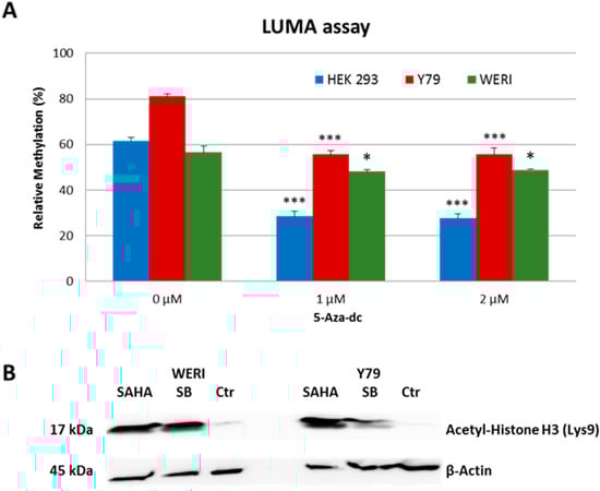 Effect of 5-Aza-dc or HDACi on DNA methylation or histone acetylation in cell culture. (A) 5-Aza-dc treatment of HEK 293, Y79, and WERI cells results in a global DNA hypomethylation in all three cell lines. Student’s t-test: *, p < 0.05 and ***, p < 0.001; treated vs untreated cells. The relative methylation (%) is the average of triplicates ± SD. (B) Western blot of WERI and Y79 cells treated with HDACi shows increased acetyl-Histone H3 (Lys9). β-actin serves as a loading control.