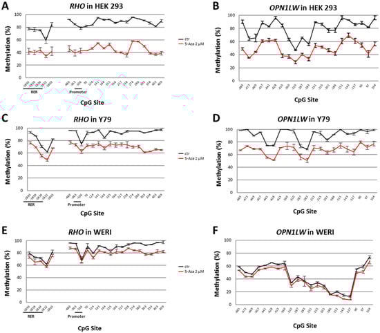 Bisulfite pyrosequencing and qPCR assays were performed to determine the effect of drug treatment on DNA methylation and mRNA expression of representative rod and cone photoreceptor-specific genes (RHO and OPN1LW) in HEK 293, Y79, and WERI cells. The methylation level of 17 CpGs within 900 bp around the transcription start site (TSS) of RHO, 21 CpGs within 600 bp around the TSS of OPN1LW, and 5 CpGs located in the 100 bp rhodopsin enhancer region (RER) located 1.8–1.9 kb upstream of the TSS of RHO [25] were measured (Figure 2). Compared with untreated cells, treatment with both doses of 5-Aza-dc (1 or 2 µM) resulted in a significant decrease in DNA methylation around the TSS and RER of RHO and the TSS of OPN1LW in all three cell lines (p < 0.0001 for HEK 293 and Y79, p < 0.002 for WERI; only 2 µM 5 Aza-dc treatment shown in Figure 2). Similar DNA hypomethylation levels were seen with 5-Aza-dc combined with SB or SAHA treatments (data not shown). This effect was not seen for SB or SAHA-only treatments (data not shown).