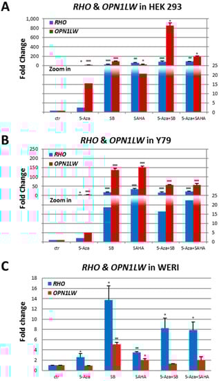 5-Aza-dc and/or HDACi enhance RHO and OPN1LW gene transcription in tissue culture cells. (A) HEK 293. (B) Y79. (C) WERI. Treatment with 5-Aza-dc (2 µM) or HDACi (SB, 2 mM or SAHA, 3 µM) of HEK 293, Y79, and WERI cells results in a significant increase of RHO or OPN1LW expression in all cases except 5-Aza-dc on OPN1LW in WERI cells. Treatment with both 5-Aza-dc and an HDACi further upregulates the expression of RHO and OPN1LW in HEK 293 cells and RHO in WERI cells. Student’s t-test: drug versus control, *, p < 0.05; **, p < 0.01; ***, p < 0.001. Normalized to HPRT1, HMBS & GAPDH. The fold change is the average of triplicates ± SD.