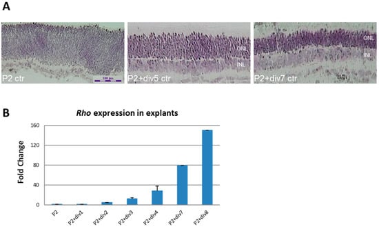 As previously reported [26,27,28], we were able to culture mouse retinal explant ex vivo and characterize the temporal expression patterns of mouse Rho in retinal explants without drug treatment (Figure 4). Mouse retinal explants obtained from wild-type P2 pups that were ex vivo cultured until P2+div5 and P2+div7 underwent morphologic differentiation in culture, resulting in the formation of well-defined inner (INL) and outer nuclear layers (ONL), inner and outer plexiform layers, and a ganglion cell layer (Figure 4A). Expression of mouse Rho at P2, P2+div1, P2+div2, P2+div3, P2+div4, P2+div7, and P2+div8 increased exponentially from P2+div3 to P2+div8 (Figure 4B).