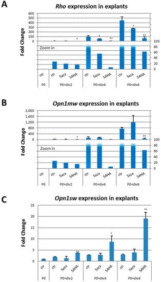 qPCR analysis of changes in Rho, Opn1mw or Opn1sw expression in P0 retinal explants ex vivo cultured showed a steady increase in the expression levels of all three mouse opsin genes in untreated explants (ANOVA: p = 0.001 for Rho, p = 0.0007 for Opn1mw, p < 0.0001 for Opn1sw; Figure 7A–C). SAHA significantly increased Opn1sw expression (Figure 7C) but decreased Rho (Figure 7A) and Opn1mw expression (Figure 7B) compared to untreated explants. 5-Aza-dc significantly decreased mouse Rho (Figure 7A) expression level in 5-Aza-dc treated explants compared with untreated ones, while it had no significant effect on Opn1mw (Figure 7B) and Opn1sw (Figure 7C) expression levels. In contrast to the in vitro observation in human adult tissue culture cells (HEK 2933, Y79, and WERI), in which both 5-Aza-dc and SAHA treatments significantly increased RHO expression, in developing postnatal retinal explants, 5-Aza-dc and SAHA treatments decreased mouse Rho expression at each time point relative to no drug treatment. However, the expression level of Rho did steadily increase over time in culture with drug treatments (ANOVA: p < 0.0001 for 5-Aza-dc and p = 0.09 for SAHA; Figure 7A), such that drug treatment essentially shifted the time-course expression curve to the left and earlier time points.