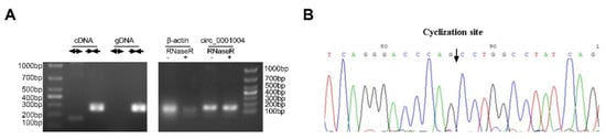 Characterization of rno_circ_0001004 in a GH3 cell. (A) PCR analysis for rno_circ_0001004 in the cDNA and gDNA of a GH3 cell.(left) Total RNA from GH3 cells with or without RNase R treatment was subjected to RT-PC.(right) (B) The back-splice junction of rno_circ_0001004 was identified by Sanger sequencing.
