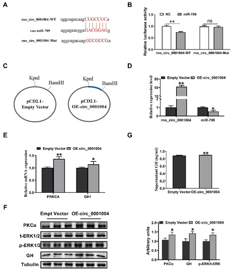 Rno_circ_0001004 antagonizes miR-709-mediated repression the synthesis and secretion of GH. (A) Bioinformatics target prediction. (B) Dual luciferase reporter gene assay verified. (C) Construction of rno_circ_0001004 overexpression vector. (D) Expression of rno_circ_0001004 along with miR-709 in empty vector and overexpression vector in GH3 by qRT-PCR. (E) mRNA level of PKCA and GH1 after transfection of OE-circ_0001004. (F) Western blot evaluation results of PKCα, t-ERK1/2, p-ERK1/2 and GH protein expression following transfection with rno_circ_0001004 in GH3 cells. (G) changes in supernatant GH level: average expression rose from 0.87 to 0.9 ng/mL. (* p < 0.05; ** p < 0.01).