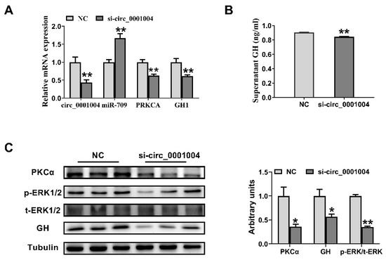 In order to further verify the effect of rno_circ_0001004 on GH, we transfected si-circ_0001004 to GH3 cells. As expected, si-circ_0001004 significantly decreased the expression of circ_0001004, while it correspondingly increased the miR-709 expression level, followed by the inhibition of mRNA in PRKCA and GH1 (Figure 3A). Furthermore, a Western blot revealed that the protein expression of PKCα, the phosphorylation of ERK1/2, and GH both in cell and supernatant all decreased with the inhibition of circ_0001004 (Figure 3B,C). The above results further confirm that rno_circ_0001004 regulates the synthesis and secretion of GH by acting as a molecular sponge for miR-709.